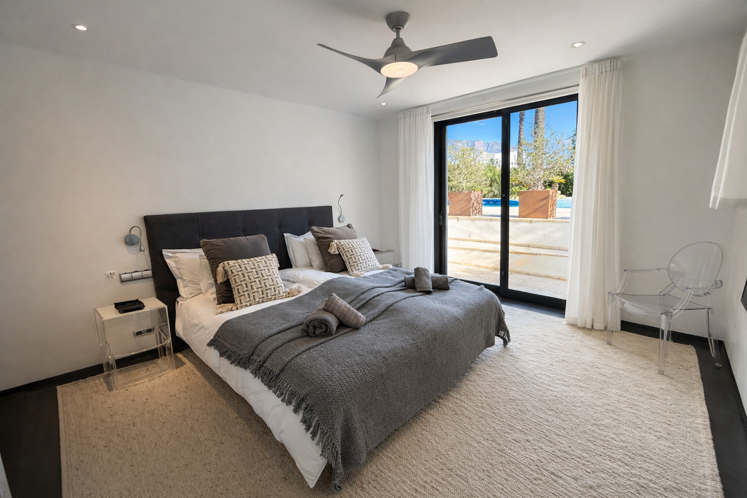 3 bedrooms: Master bedroom on the first floor. Very spacious bedroom with double bed, flat screen TV, walk-in closet, air conditioning, ceiling fan, bathroom en-suite with both shower and bathtub. Balcony and large sliding doors with a unique view to the pool area and the majestic mountains of Marbella.