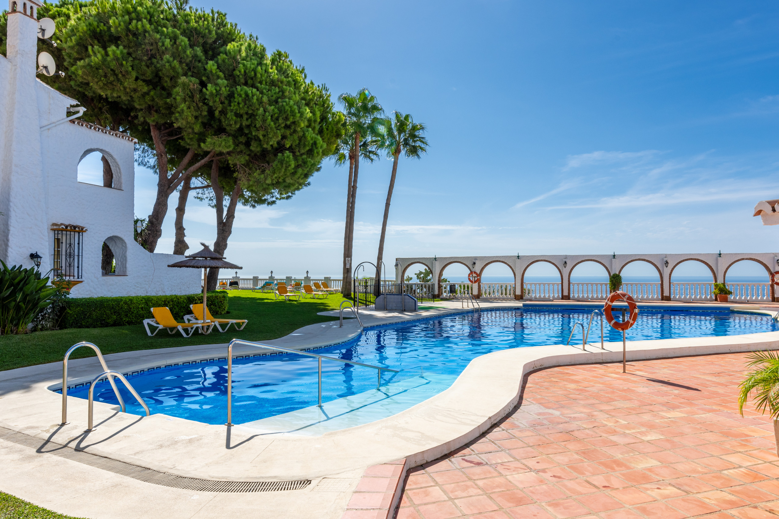 From the apartment you have direct access to the beautiful communal garden with 2 swimming pools. The main swimming pool is close to the apartment and has breathtaking panoramic views of the Mediterranean Sea and the coasts of Torremolinos, Benalmádena and Fuengirola. The pool area has a large sunbathing lawn with sun beds, parasols, showers and toilets. A varied selection of water toys found in the apartment is freely available for children.