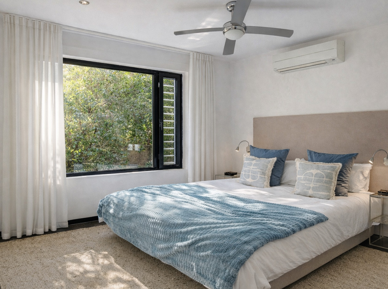 4 bedroom: Located downstairs / basement and has direct access to the pool area. Double Bed, flat screen TV, built-in wardrobe, air conditioning, ceiling fan, bathroom en-suite with shower.