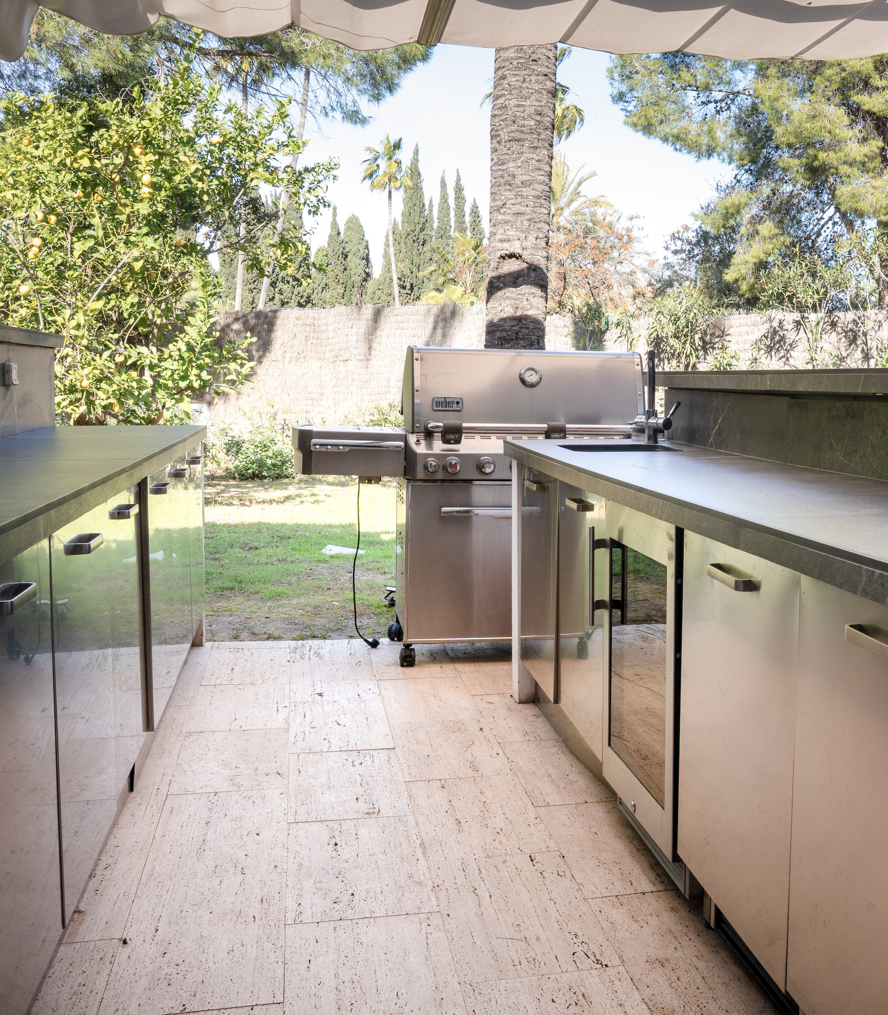 Outdoor kitchen with bar and BBQ area with 2 refrigerators, one freezer, wine cooler, ice cube machine, drinking water and sink, dishwasher and electrical awning above the bar. Quality patio furniture, provides ample opportunity for some pleasant evenings on the terrace.